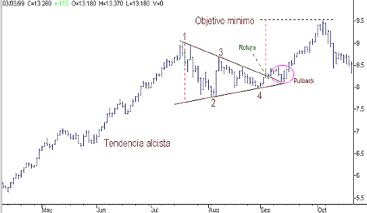 El objetivo de la formación se calcula midiendo la altura del triángulo, es decir, la distancia entre las dos líneas de tendencia tomada desde el punto uno. Esta distancia se proyecta desde el punto donde el precio perfora la formación y nos da un objetivo mínimo de hasta dónde continuará la tendencia.